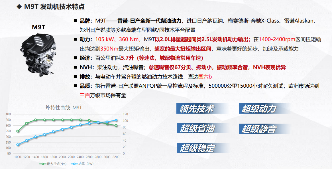 全新東風(fēng)御風(fēng)V9+全新一代御風(fēng)V9+采用雷諾日產(chǎn)M9T發(fā)動(dòng)機(jī)?!鬗9T發(fā)動(dòng)機(jī)技術(shù)特點(diǎn)■品牌:M9T——雷諾-日產(chǎn)全新一代柴油動(dòng)力,進(jìn)口日產(chǎn)納瓦納、梅賽德斯-奔馳X-Class、雷諾Alaskan、鄭州日產(chǎn)銳騏等多款高端車型同款/同技術(shù)平臺(tái)配置?!鰟?dòng)力:105kW、360Nm,M9T以2.0L排量超越同類2.5L發(fā)動(dòng)機(jī)動(dòng)力輸出;在1400-2400rpm區(qū)間扭矩輸出均達(dá)到350Nm最大扭矩輸出,超寬