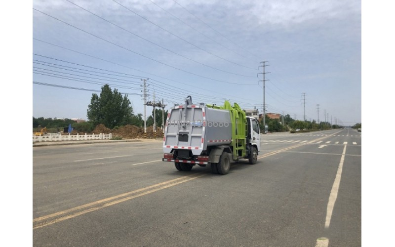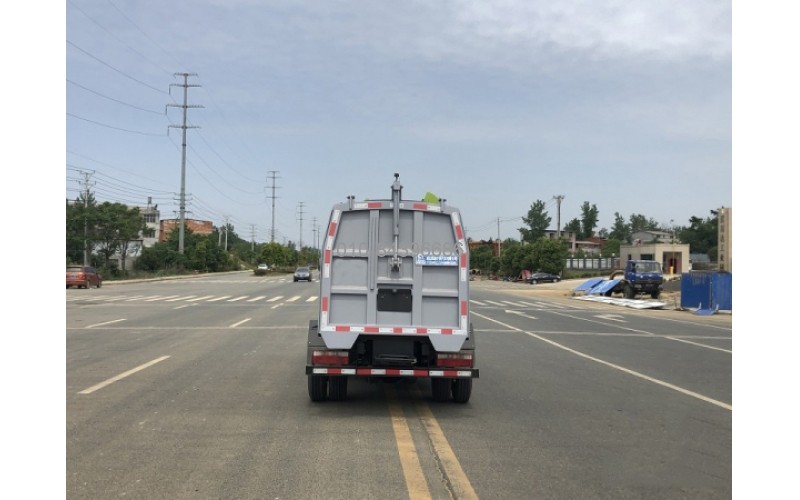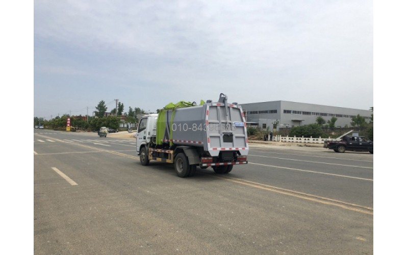 采用全金屬矩形結(jié)構(gòu)的密封式垃圾箱,在垃圾箱的上部設(shè)有進(jìn)料箱蓋,使整車美觀大方,而且防止垃圾的傾灑。側(cè)面裝有自裝料設(shè)置,極大的減輕了操作人員的工作量。在垃圾箱尾部裝有液壓舉升裝置,使操作人員卸垃圾時不用出駕駛室就可以打開后門。